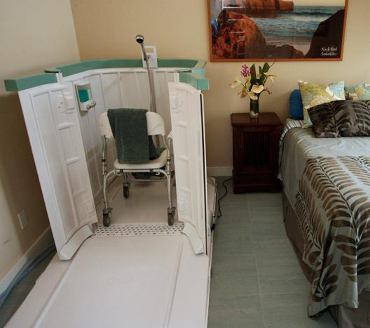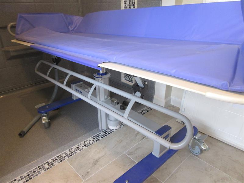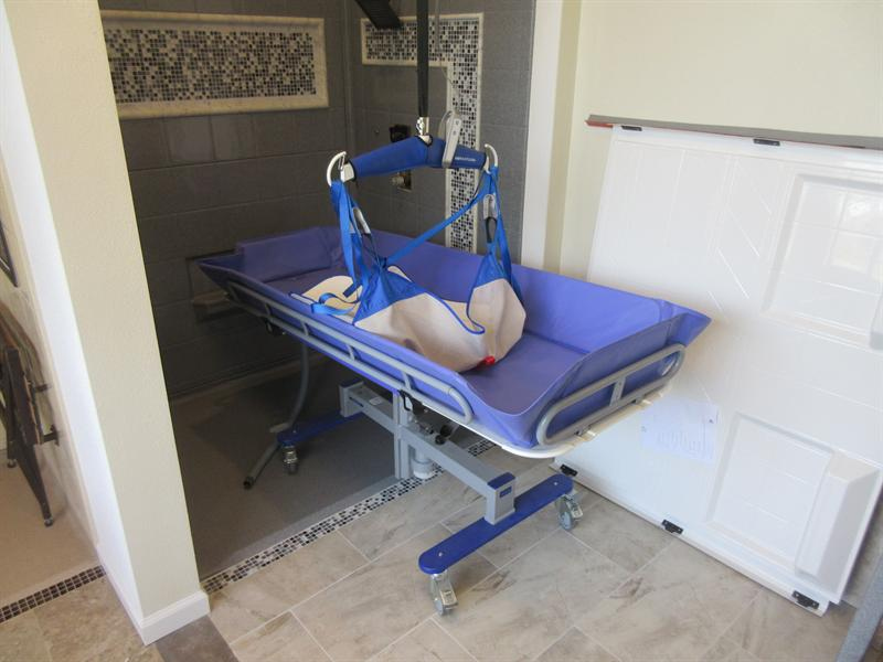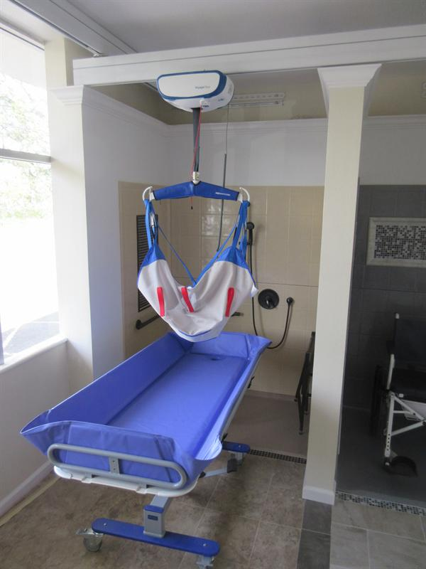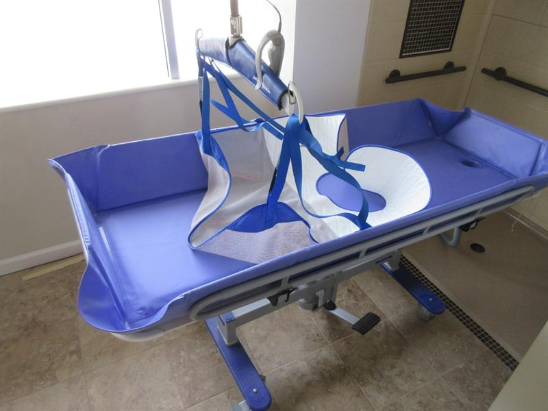 It enables the caregiver to transport residents/patients from the bed to the shower, and back again, without any manual lifting, thereby reducing the risk of back injuries.